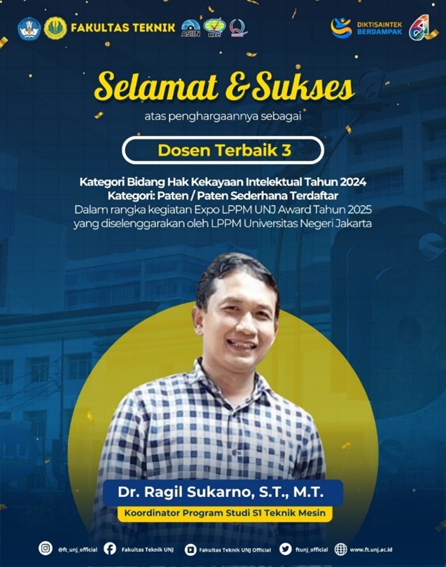 Dalam semangat “Berkarya untuk Indonesia: Integrasi Inovasi Penelitian, Pengabdian, dan Kemandirian dalam Membangun Masa Depan”, Fakultas Teknik Universitas Negeri Jakarta (UNJ) menegaskan peran strategisnya dalam pengembangan riset dan inovasi melalui ajang Riset Expo dan LPPM UNJ Award Tahun 2025. Kegiatan ini menjadi momentum penting untuk memperkuat sinergi antara penelitian, pengabdian kepada masyarakat, dan hilirisasi hasil riset menuju kemandirian bangsa. Fakultas Teknik Universitas Negeri Jakarta (UNJ) kembali menorehkan prestasi membanggakan dalam ajang LPPM UNJ Award Tahun 2025. Kegiatan ini merupakan bentuk apresiasi kepada para dosen dan fakultas atas kontribusi luar biasa dalam bidang penelitian, pengabdian kepada masyarakat, Hak Kekayaan Intelektual (HKI), publikasi ilmiah, sitasi, dan pengelolaan jurnal. Dalam ajang bergengsi ini, dua dosen dari Fakultas Teknik UNJ berhasil meraih penghargaan sebagai dosen terbaik dalam kategori Hak Kekayaan Intelektual Tahun 2024 – Paten/Paten Sederhana Terdaftar, yaitu: Dr. Neneng Siti Silfi Ambarwati, S.Si., Apt., M.Si., Dekan Fakultas Teknik UNJ, meraih penghargaan sebagai Dosen Terbaik 2. Ragil Sukarno, S.T., M.T., Koordinator Program Studi S1 Teknik Mesin, meraih penghargaan sebagai Dosen Terbaik 3 Tidak hanya itu, Fakultas Teknik UNJ juga dinobatkan sebagai: Fakultas Terbaik I dalam Kategori Bidang Hak Kekayaan Intelektual Tahun 2024; Fakultas Terbaik III dalam Kategori Jurnal UNJ Terakreditasi SINTA Terbanyak; Fakultas Terbaik III dalam Kategori Publikasi Ilmiah Internasional Bereputasi (Scopus) Tahun 2024. Prestasi ini merupakan bukti nyata komitmen Fakultas Teknik UNJ dalam mendukung budaya riset, inovasi, dan publikasi ilmiah yang berkualitas tinggi. Fakultas Teknik UNJ senantiasa berupaya mendorong untuk terus menghasilkan karya yang berdampak bagi masyarakat, serta memperkuat posisi UNJ sebagai institusi pendidikan tinggi yang unggul dan kompetitif di tingkat nasional maupun internasional. Selamat dan sukses kepada para dosen dan seluruh civitas akademika Fakultas Teknik UNJ. Teruslah berkarya untuk Indonesia! Navigasi pos Mahasiswa Fakultas Teknik Raih Tanda Jasa Nasional atas Kontribusi dalam Bidang Fashion