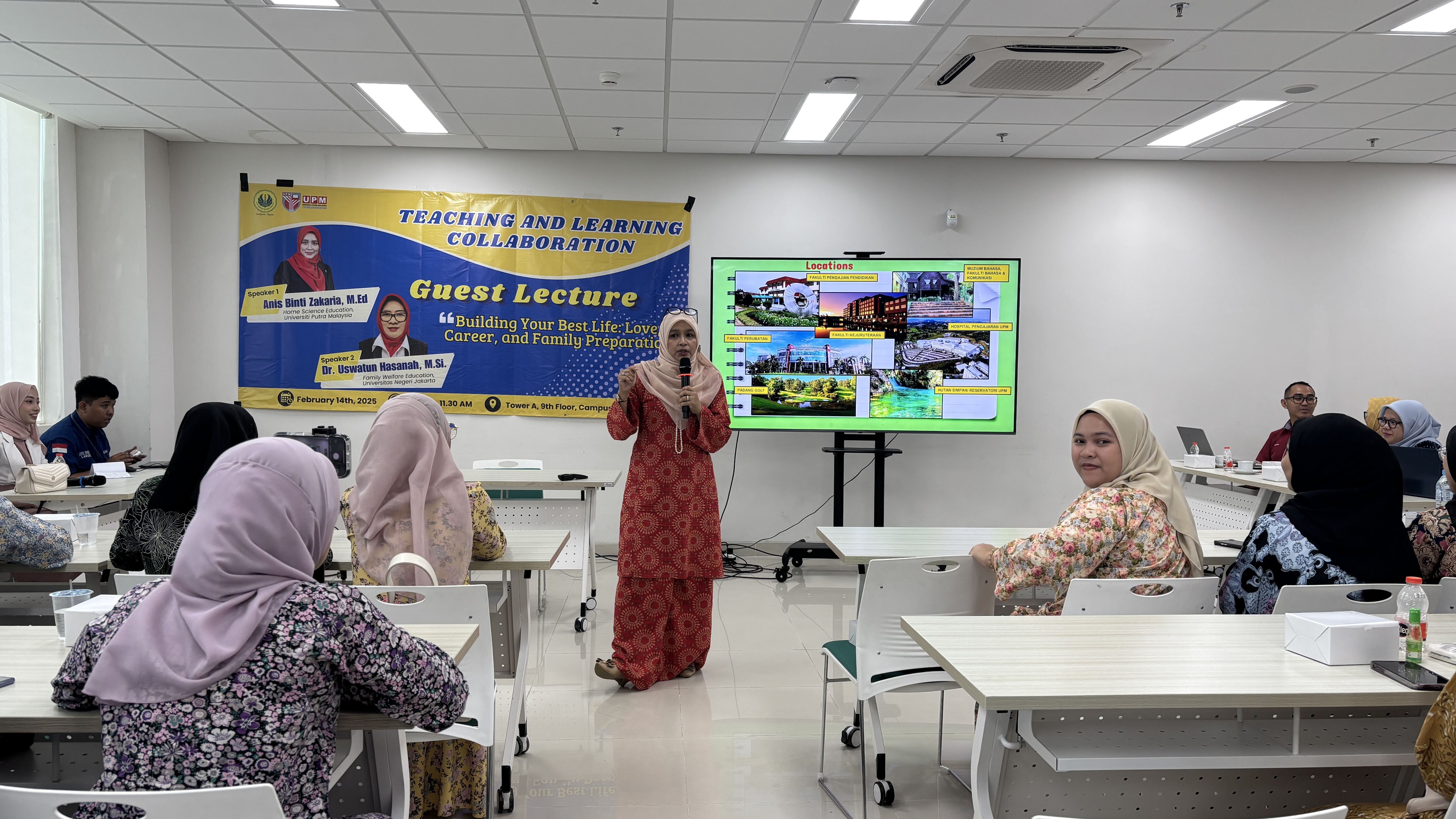 Jumat, 14 Februari 2025 telah dilakukan kegiatan guest lecture dengan tema “Building your best life: love, career, and family preparation“. Kegiatan ini dilaksanakan di ruang perkuliahan Gedung SFD Tower A lantai 9. Sebanyak 76 mahasiswa turut hadir dan memeriahkan kegiatan ini. Dari UPM, Pn Anis Binti Zakaria menyampaikan materi terkait Grooming. Bu Anis menceritakan bagaimana kesan pertama itu amat penting dalam dunia karir. Penampilan dan pembawaan diri menjadi hal krusial saat pertemuan pertama. Sementara itu, Dr. Uswatun Hasanah, M.Si dari UNJ menyampaikan materi mengenai persiapan berkeluarga. Beliau membandingkan usia minimum bagi laki-laki dan perempuan yang akan menikah, baik menurut hukum di Indonesia maupun Malaysia. Beliau juga menyampaikan peran-peran yang harus dijalani oleh individu dalam berkeluarga. Kegiatan dilanjutkan dengan penyampaian kurikulum. Kurikulum menjadi salah satu kunci utama dalam pelaksanaan kerja sama pada bidang pengajaran. Kurikulum juga menjadi salah satu pertimbangan bagi calon mahasiswa sebelum menentukan pilihan tempat berkuliah. Dalam rangkaian pelaksanaan kerja sama antara UNJ dengan UPM, Pn Anis Binti Zakaria selaku Koordinator Program Studi menyampaikan kurikulum yang digunakan di Bacelor Pendidikan Sains Rumah Tangga. Setelah itu, Elmanora, M.Si juga menyampaikan kurikulum di Program Studi Pendidikan Kesejahteraan Keluarga. Dengan demikian, mahasiswa dari UNJ dan UPM dapat membandingkan kurikulum dari kedua program studi tersebut. Navigasi pos Student Mobility Programme: Kolaborasi Internasional antara UNJ dan UPM dalam Pertukaran Mahasiswa International Collaboration Community Service Programme